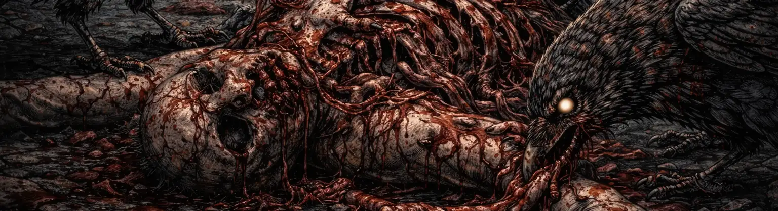 A Primeira Vítima: Um membro do grupo (NPC ou jogador) tropeça. Em segundos, ele desaparece sob uma massa negra que se contorce. Os gritos são substituídos por sons úmidos de carne sendo rasgada. Quando os corvos se dispersam brevemente, resta apenas ossos vermelhos e tiras de músculo.